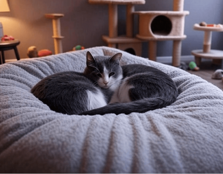 It is also critical to provide your cat with some space to retreat to when they are feeling stressed. The result may be a room or a designated space with familiar scents and cozy bedding. Your goal is to create calm and security and eliminate anxiety when left alone.